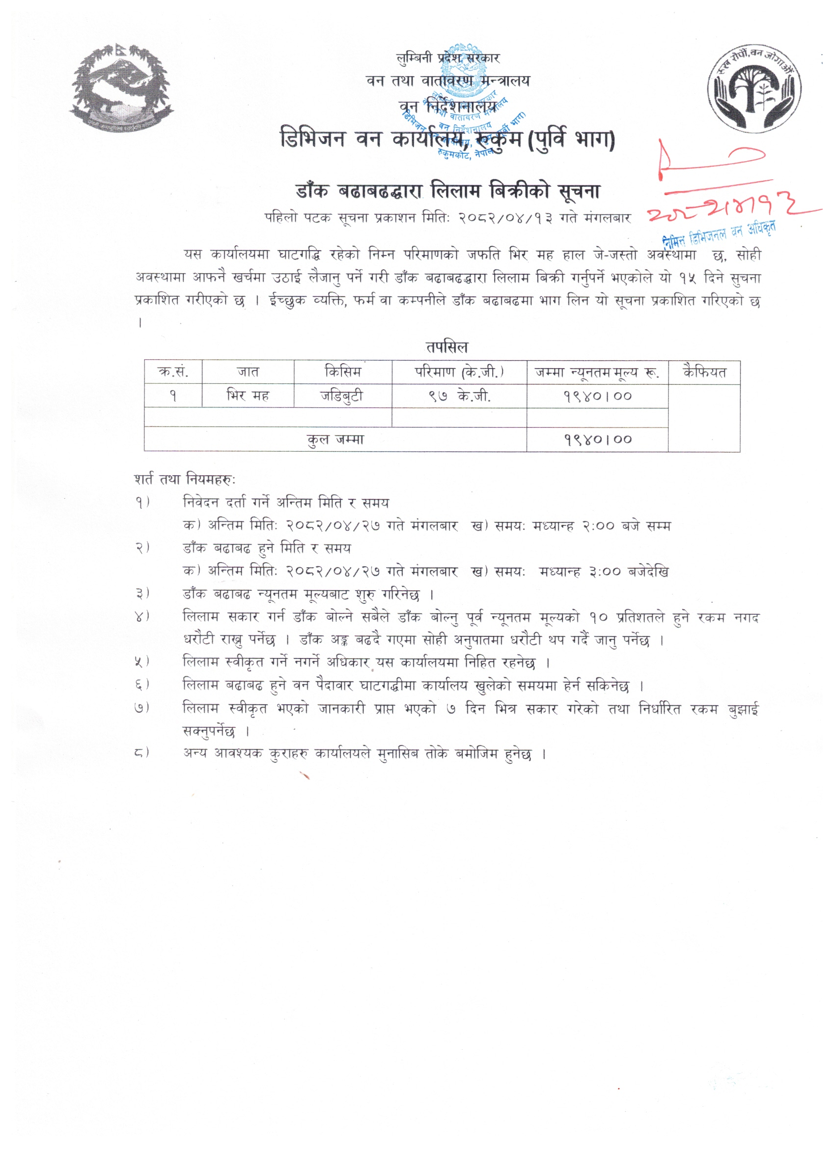 साउन २०, २०८२ डाँक बढाबढद्वारा लिलाम विक्रीको सूचना (डिभिजन वन कार्यालय, रुकुम पूर्वी भाग) २०८२।०४।१३