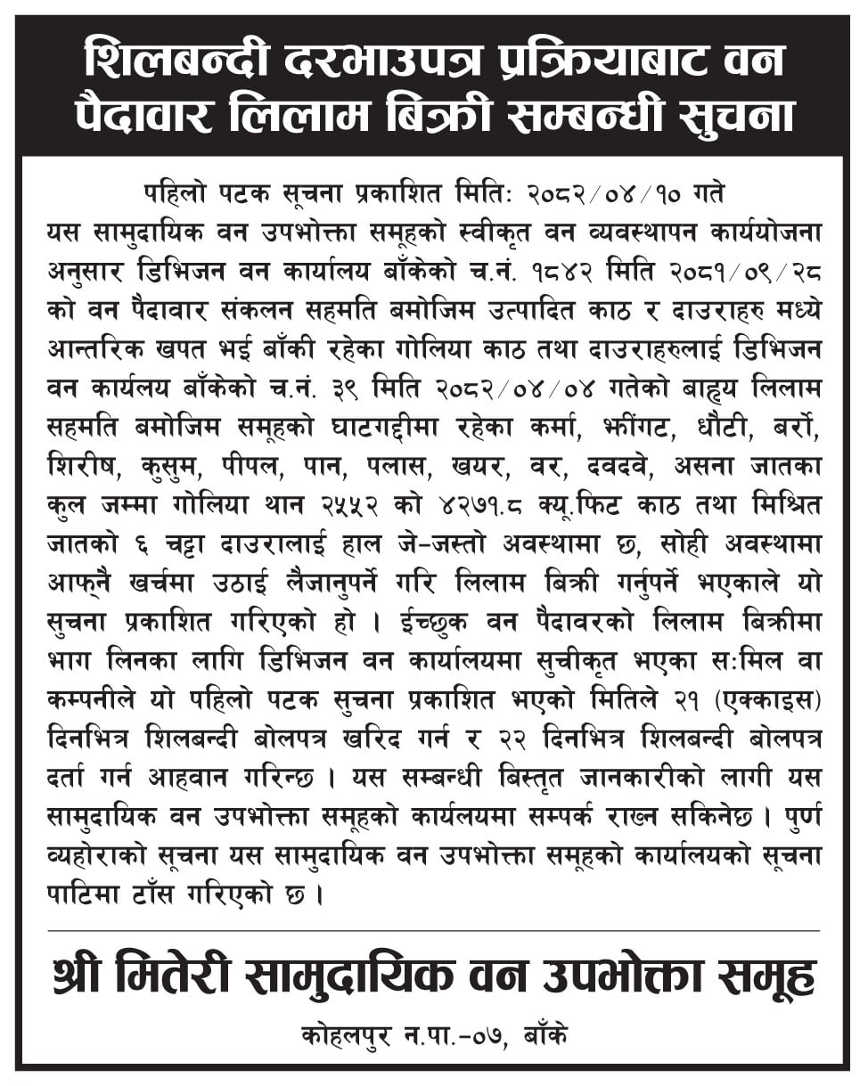 साउन १२, २०८२ शिलवन्दी दरभाउपत्र प्रक्रियाबाट वन पैदावार लिलाम विक्री सम्बन्धी सूचना (मितेरी सावउस, बाँके) २०८२।०४।१०