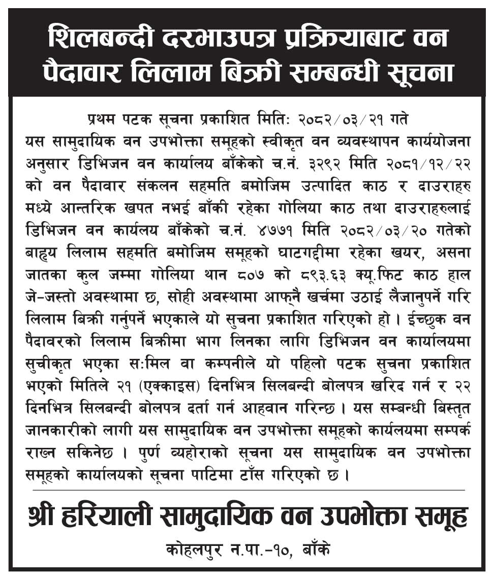 असार २४, २०८२ शिलवन्दी दरभाउपत्र प्रक्रियाबाट वन पैदावार लिलाम विक्री सम्बन्धी सूचना (हरियाली सावउस, बाँके) २०८२।०३।२१