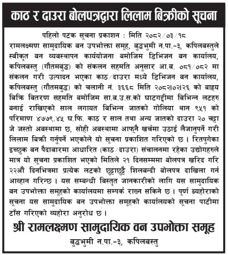 असार १८, २०८२ काठ र दाउरा बोलपत्रद्वारा लिलाम विक्रीको सुचना (रामलक्ष्मण सावउस, कपिलवस्तु) २०८२।०३।१८