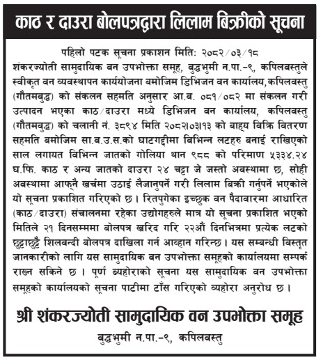 असार १८, २०८२ काठ/दाउरा बोलपत्रद्वारा लिलाम विक्रीको सुचना (शिवराज साझेदारी सावउस, कपिलवस्तु) २०८२।०३।१८