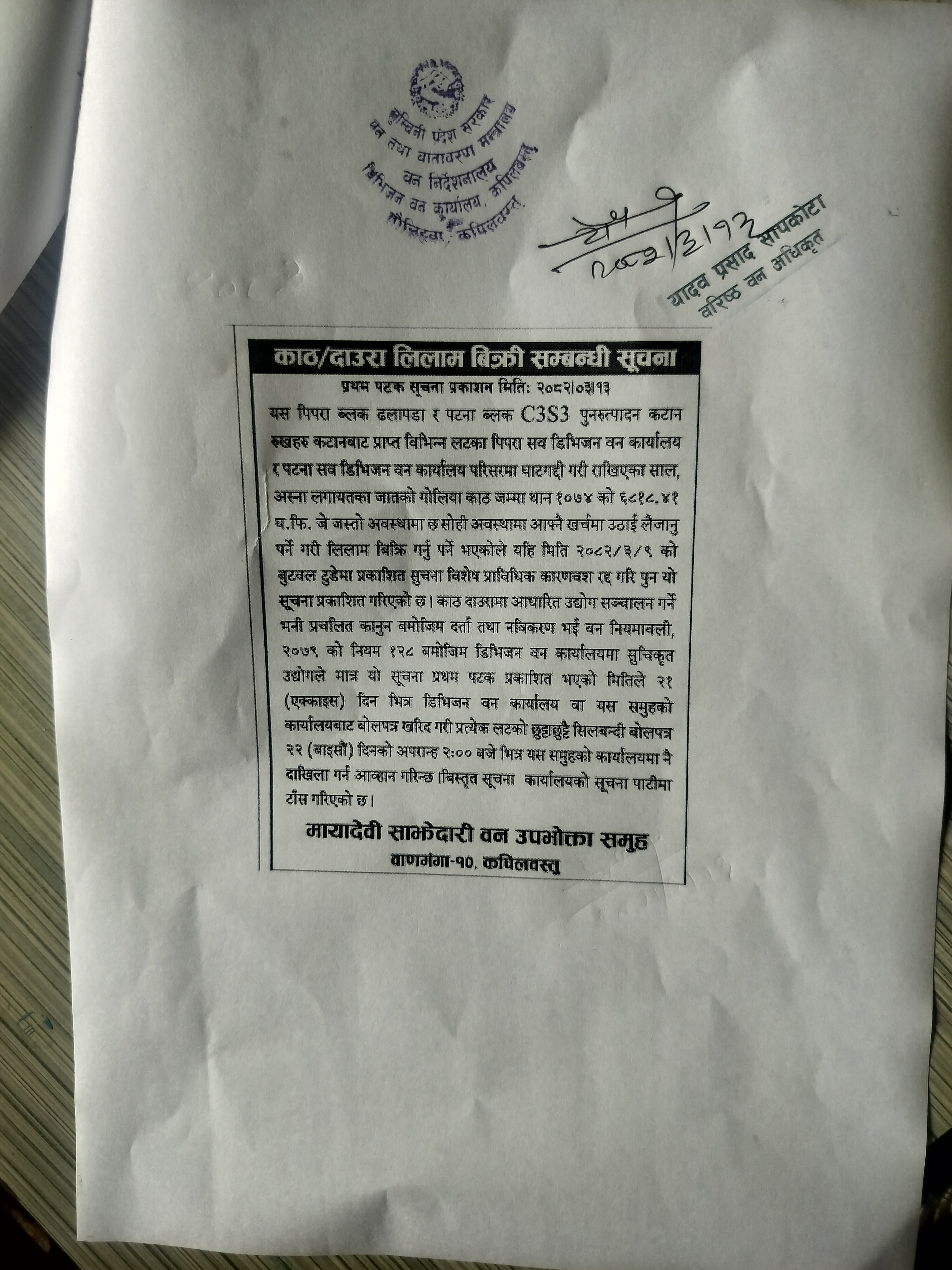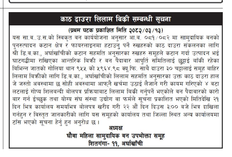 असार १७, २०८२ काठ/दाउरा लिलाम विक्री सम्बन्धी सूचना (मायादेवी सावउस, कपिलवस्तु) २०८२।०३।१३