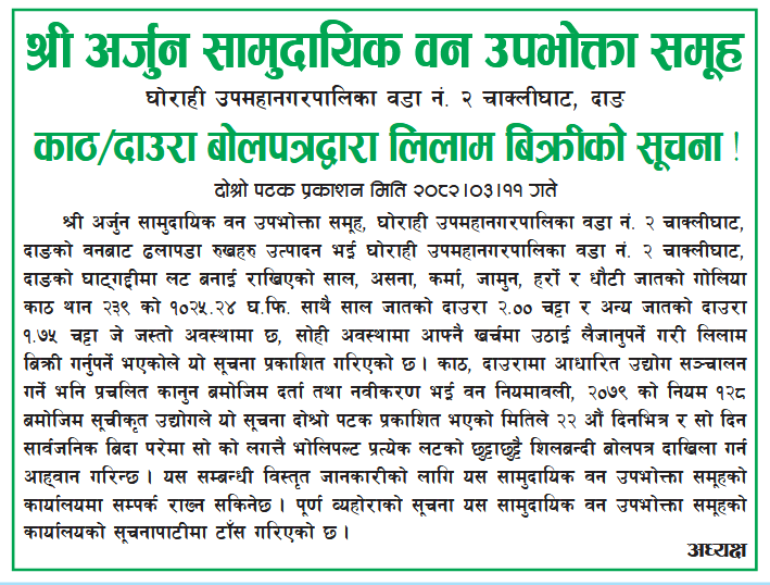 असार १७, २०८२ काठ/दाउरा बोलपत्रद्वारा लिलाम विक्रीको सूचना (अर्जुन सावउस, दाङ) २०८२।०३।११