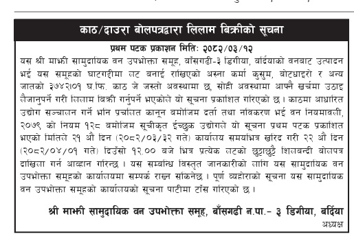 असार १७, २०८२ काठ/दाउरा बोलपत्रद्वारा लिलाम विक्रीको सूचना (खयरभट्टी सिमगैरा सावउस, दाङ) र (जुरपानी सावउस, दाङ) २०८२।०३।१२