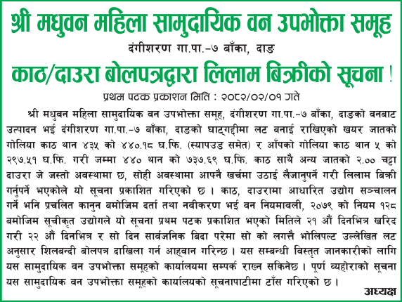 जेठ ३, २०८२ काठ/दाउरा बोलपत्रद्वारा लिलाम विक्रीको सुचना (मधुवान महिला सावउस, दाङ) २०८२।०२।०१