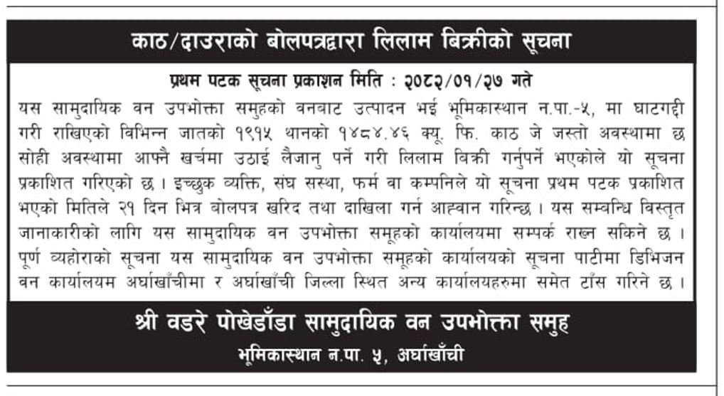जेठ ४, २०८२ काठ/दाउरा बोलपत्रद्वारा लिलाम विक्रीको सूचना (बडरे पोखेडाँडा सावउस, अर्घाखाँची) २०८२।०१।२७