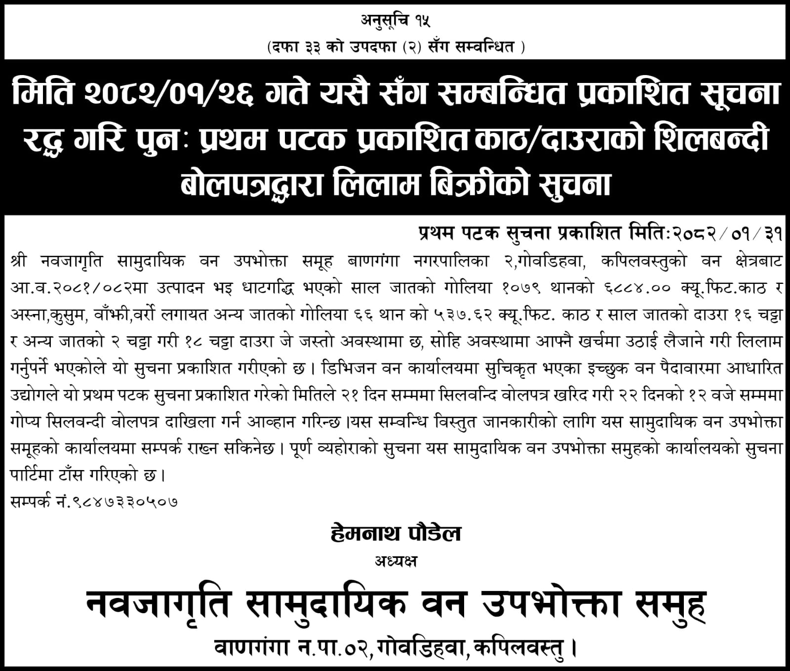जेठ ४, २०८२ काठ दाउरा बोलपत्रद्वारा लिलाम विक्रीको सूचना (कपिलमुनी सावउस, कपिलवस्तु) २०८२।०२।०१
