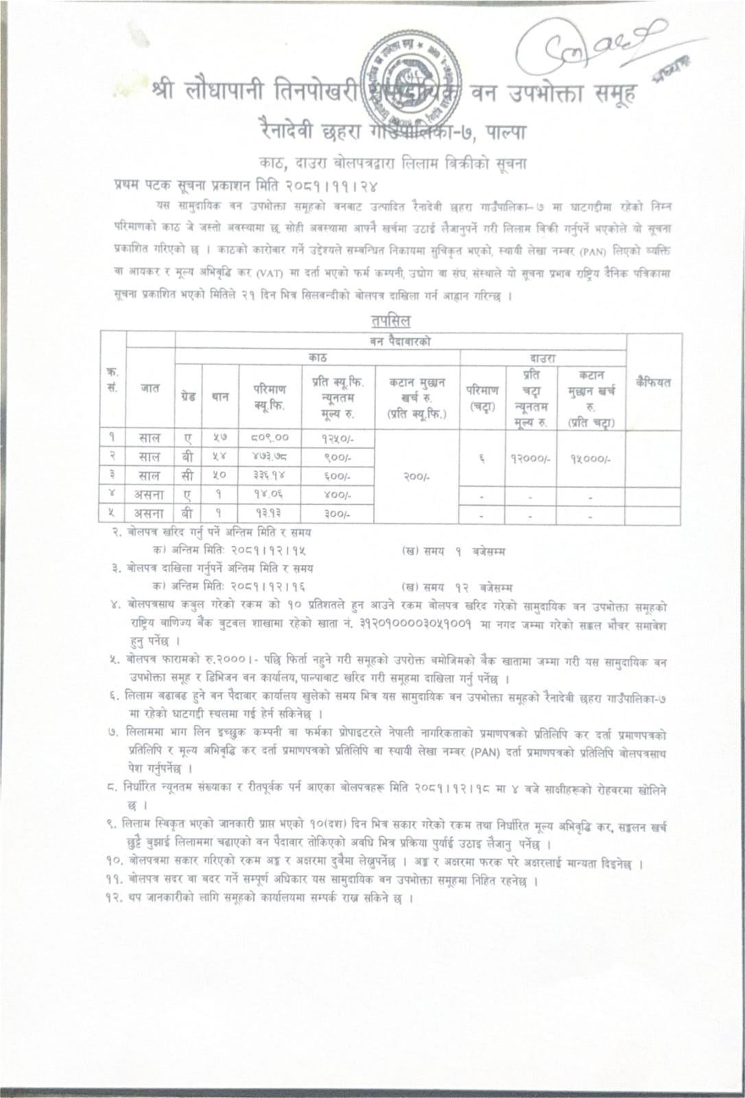 फागुन २७, २०८१ काठ दाउरा बोलपत्रद्वारा लिलाम विक्रीको सूचना (लौधापानी तीनपोखरी सावउस, पाल्पा) २०८१।११।२४
