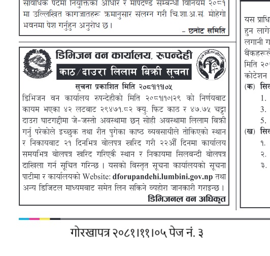 फागुन १६, २०८१ काठ दाउरा बोलपत्रद्वारा लिलाम विक्रीको सूचना (शान्ती सावउस, कपिलवस्तु) २०८१।११।१३
