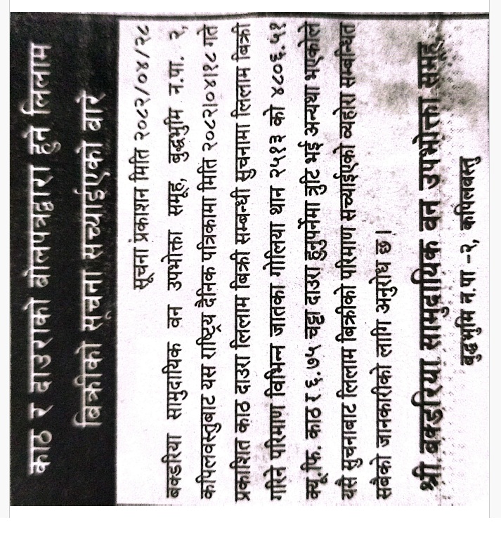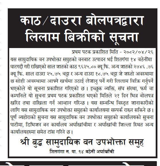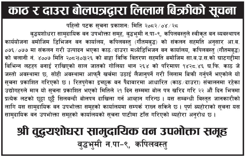 भदौ १४, २०८२ काठ र दाउरा बोलपत्रद्वारा लिलाम विक्रीको सूचना (बुद्धयशोधरा सावउस, कपिलवस्तु) २०८२।०४।२८