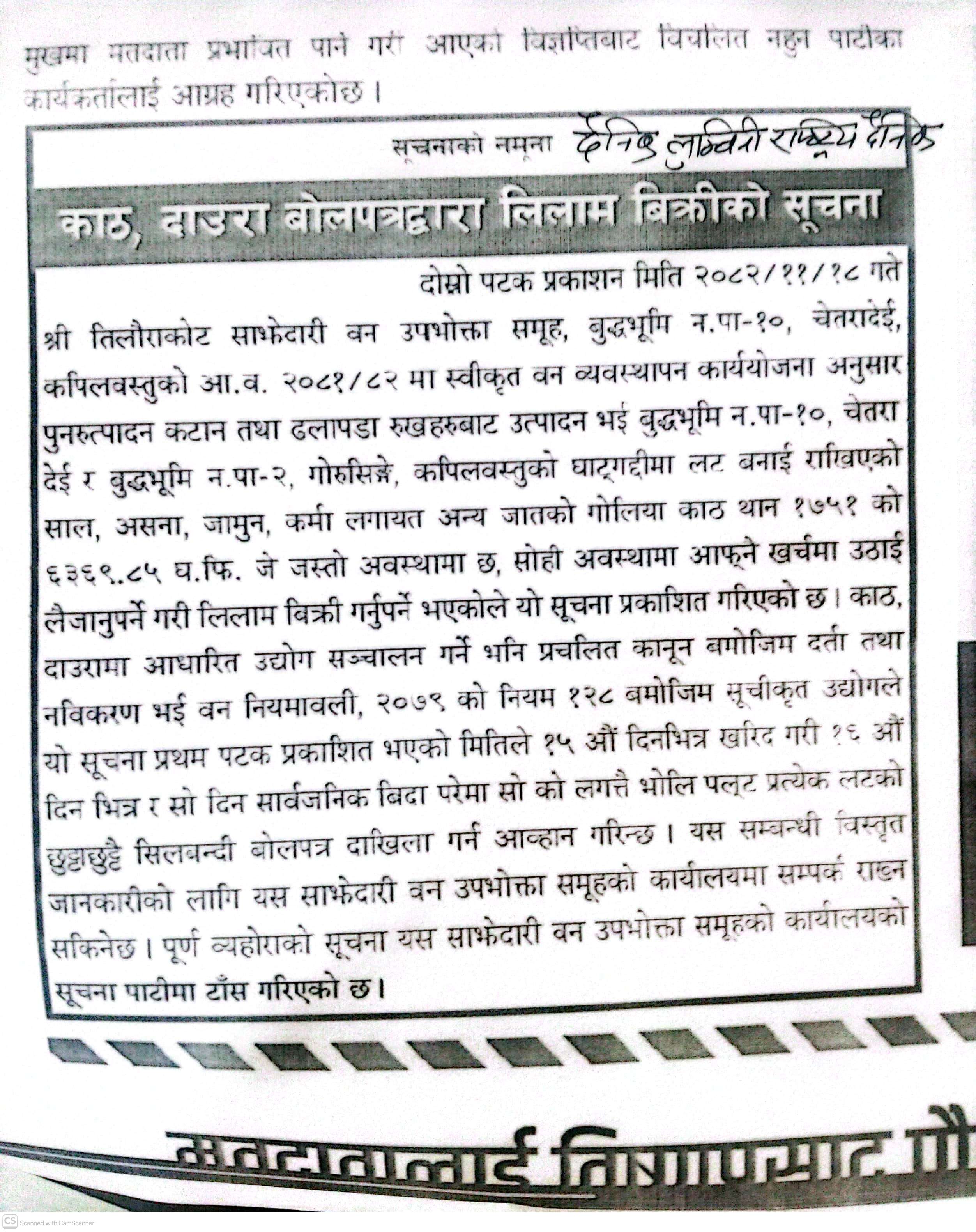 फागुन १७, २०८२ काठ र दाउरा बोलपत्रद्वारा लिलाम विक्रीको सूचना(कपिलवस्तु साझेदारी वन उपभोक्ता समूह,कपिलवस्तु) २०८२।११।१६
