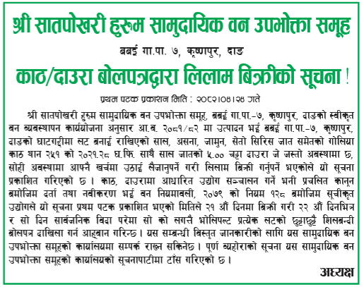 साउन २५, २०८२ काठ/दाउरा बोलपत्रद्वारा लिलाम विक्रीको सूचना (सातपोखरी हुरुम सावउस, दाङ) २०८२।०४।२४