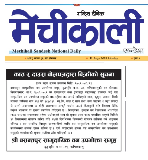 साउन २७, २०८२ काठ र दाउरा बोलपत्रद्वारा लिलाम विक्रीको सूचना (बसन्तपुर सावउस, कपिलवस्तु) २०८२।०४।२६