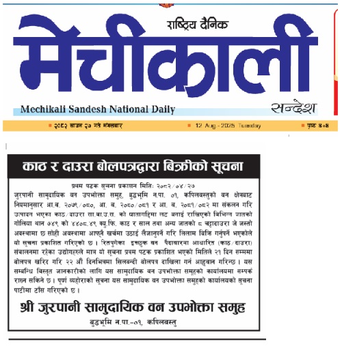 साउन २७, २०८२ काठ र दाउरा बोलपत्रद्वारा लिलाम विक्रीको सूचना (जुरपानी सावउस, कपिलवस्तु) २०८२।०४।२७
