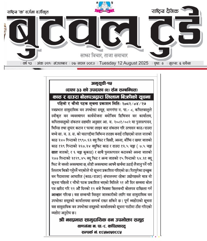 भदौ १४, २०८२ काठ र दाउरा बोलपत्रद्वारा लिलाम विक्रीको सूचना (नव प्रभात सावउस, कपिलवस्तु) २०८२।०४।२७