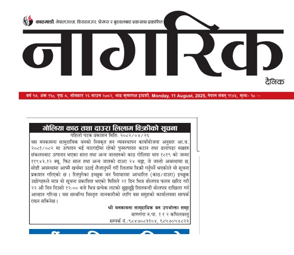 साउन २७, २०८२ गोलिया काठ तथा दाउरा लिलाम विक्रीको सूचना (मनकामना सावउस, कपिलवस्तु) २०८२।०४।२६