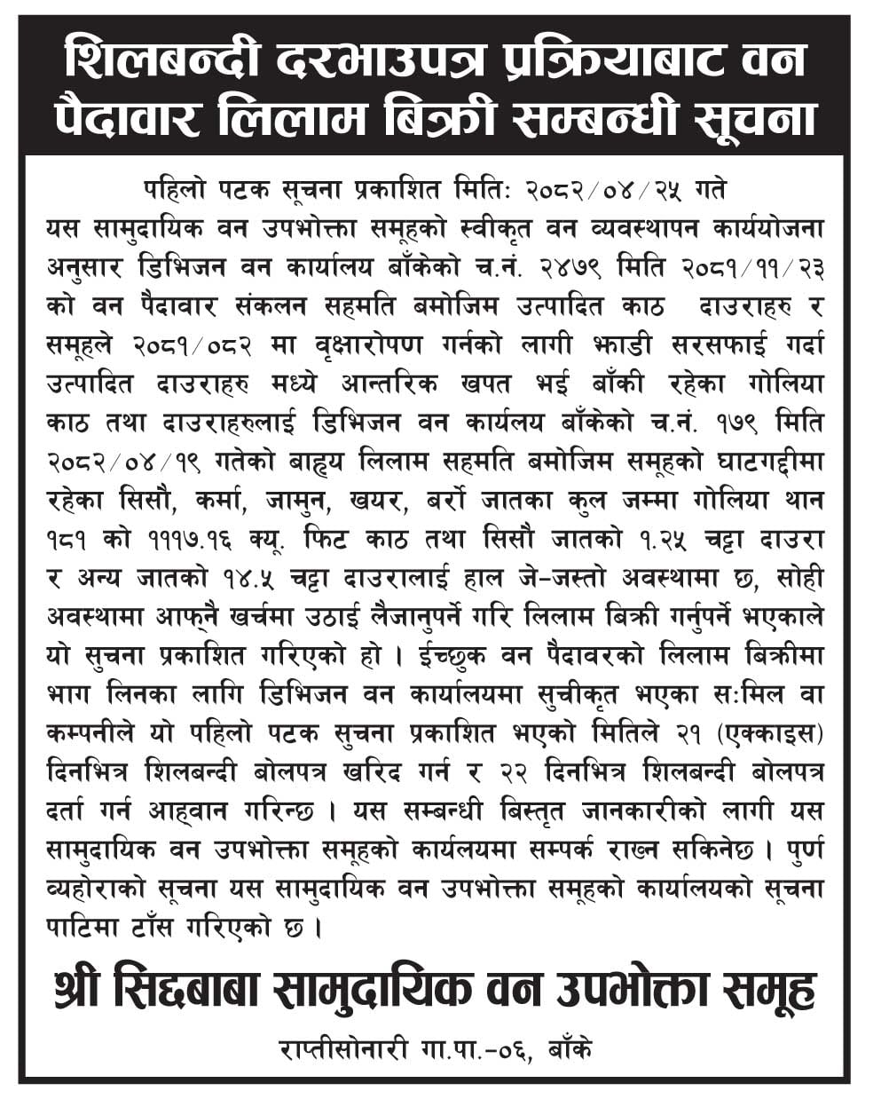 साउन २५, २०८२ शिलबन्दी दरभाउ प्रक्रियाबाट वन पैदावार लिलाम विक्री सम्बन्धी सूचना (सिद्धबाबा सावउस, बाँके) २०८२।०४।२५